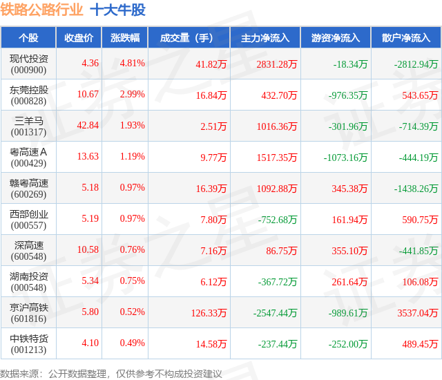 个股表现方面,铁路公路行业当日领涨股为现代投资(000900),该股当日报收4.36,上涨4.81%,成交量41.82万,主力资金净流入2831.28万元。东莞控股(000828)以上涨2.99%紧随其后,该股当日成交量16.84万,主力资金净流入432.7万元。除此之外,三羊马(001317)、粤高速a(000429)、赣粤高速(600269)均进入当日牛股之列。具体个股列表见下表: