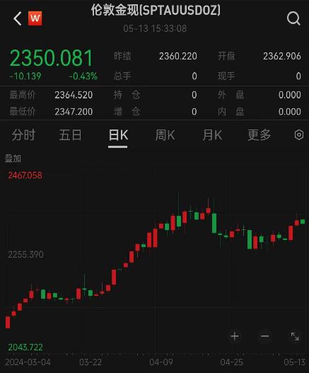 4月22日,黄金市场一夜“变天”,金价创近两年单日最大跌幅,并在23日跌破2300美元/盎司大关。4月30日,金价跌幅超过2%,再度跌破2300美元/盎司,随后缓慢收复失地,目前徘徊在2350美元/盎司附近。