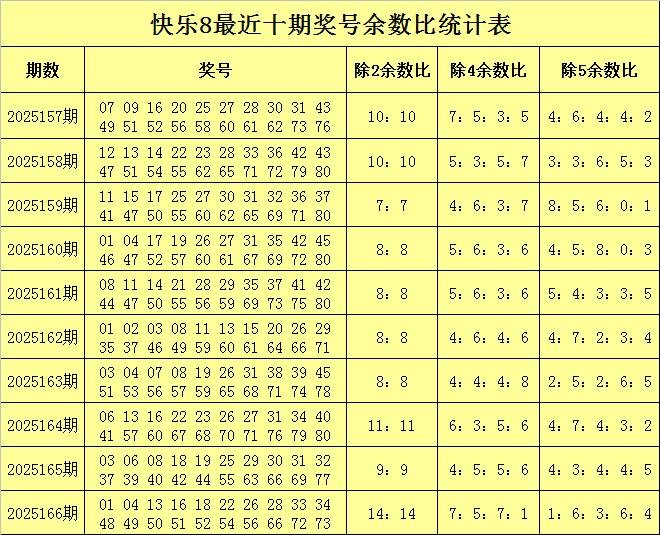 福彩快乐8第2025166期开奖回顾:01 04 13 16 18 22 26 28 33 34 48 49 50 51 52 54 56 66 72 73,其中奖号二区比为10:10,四区比为5:5:7:3,五区比为4:4:3:6:3,除2余数比为6:14,除4余数比为7:5:7:1,除5余数比为1:6:3:6:4。