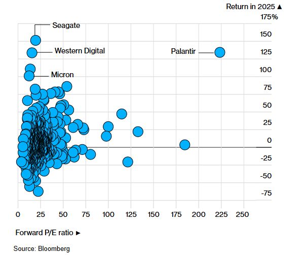电力生产商vistra继2024年飙升258%和2023年飙升66%之后,今年又上涨了53%。芯片制造商博通公司目前的市值已达1.6万亿美元,今年上涨了49%,2024年和2023年均上涨了约100%。数字存储和内存制造商sandisk本月也表现强劲,自9月2日以来飙升超过100%。